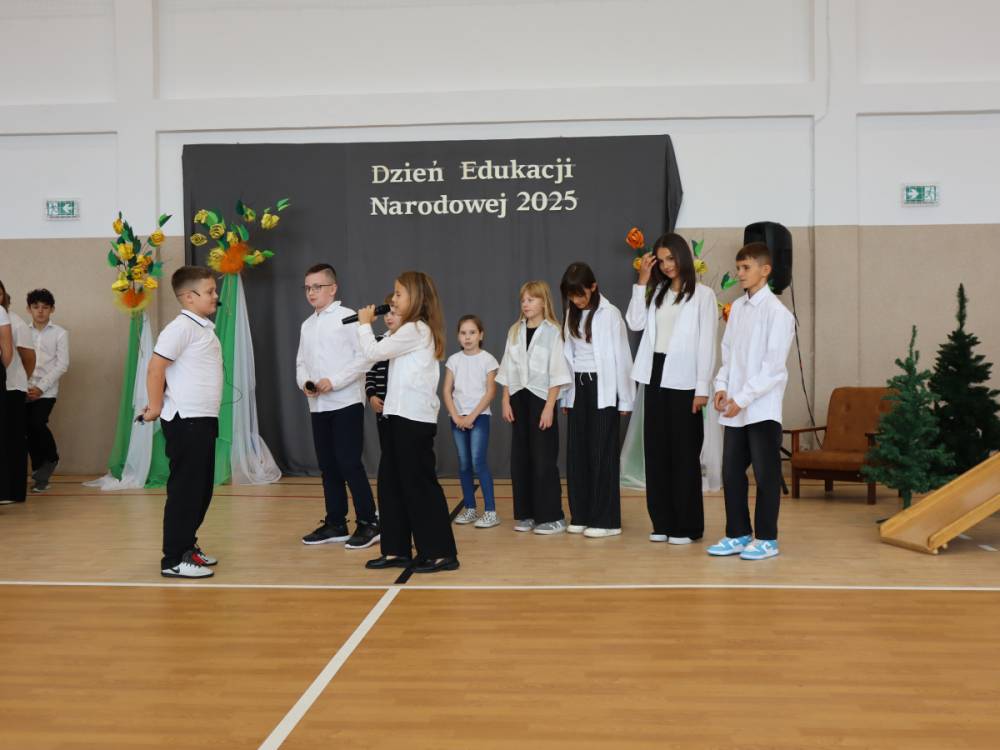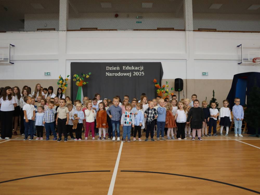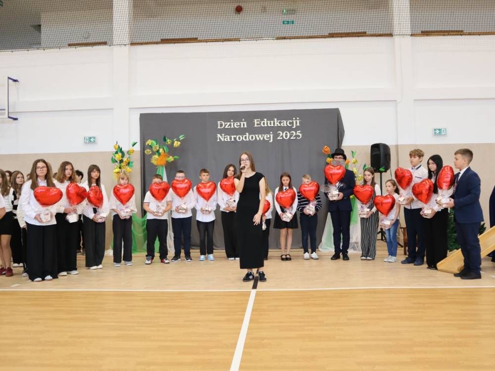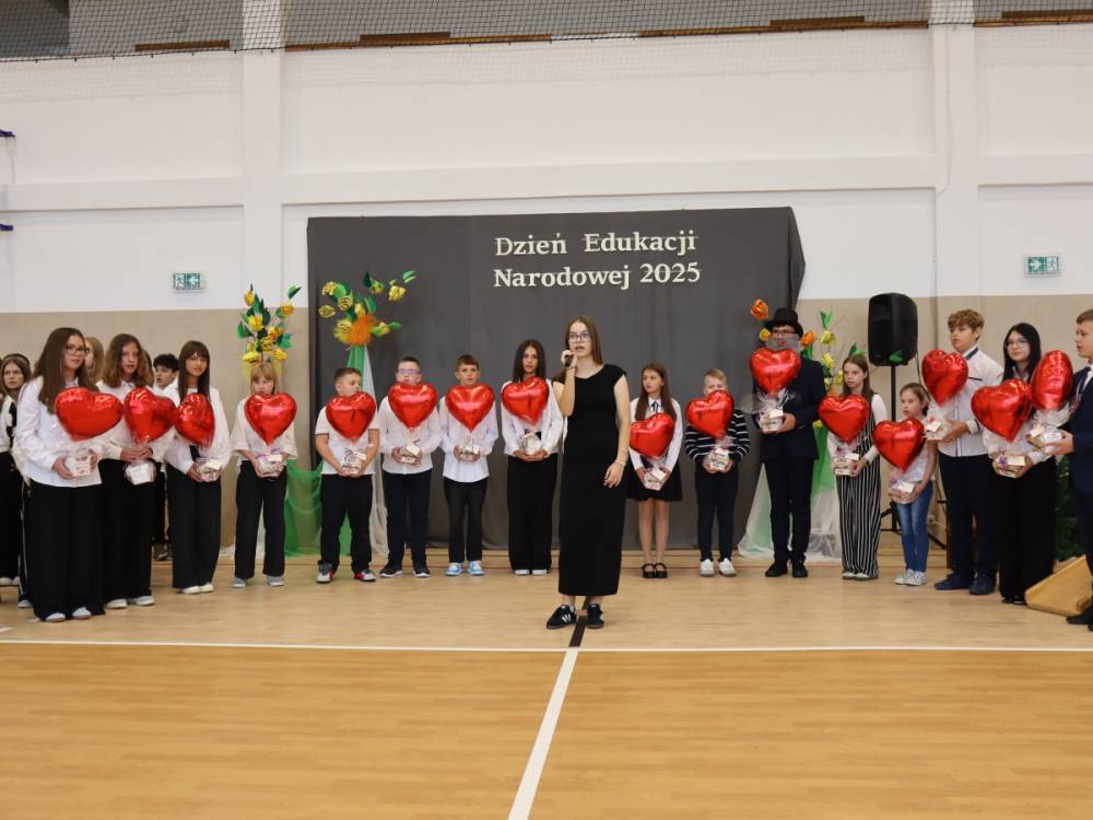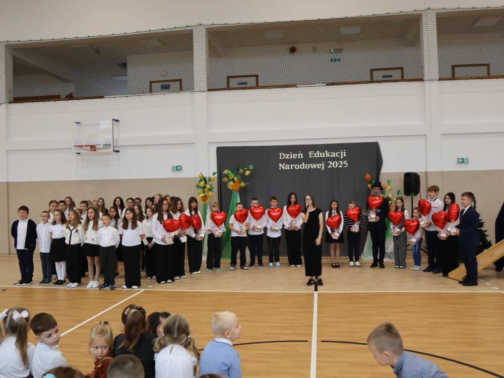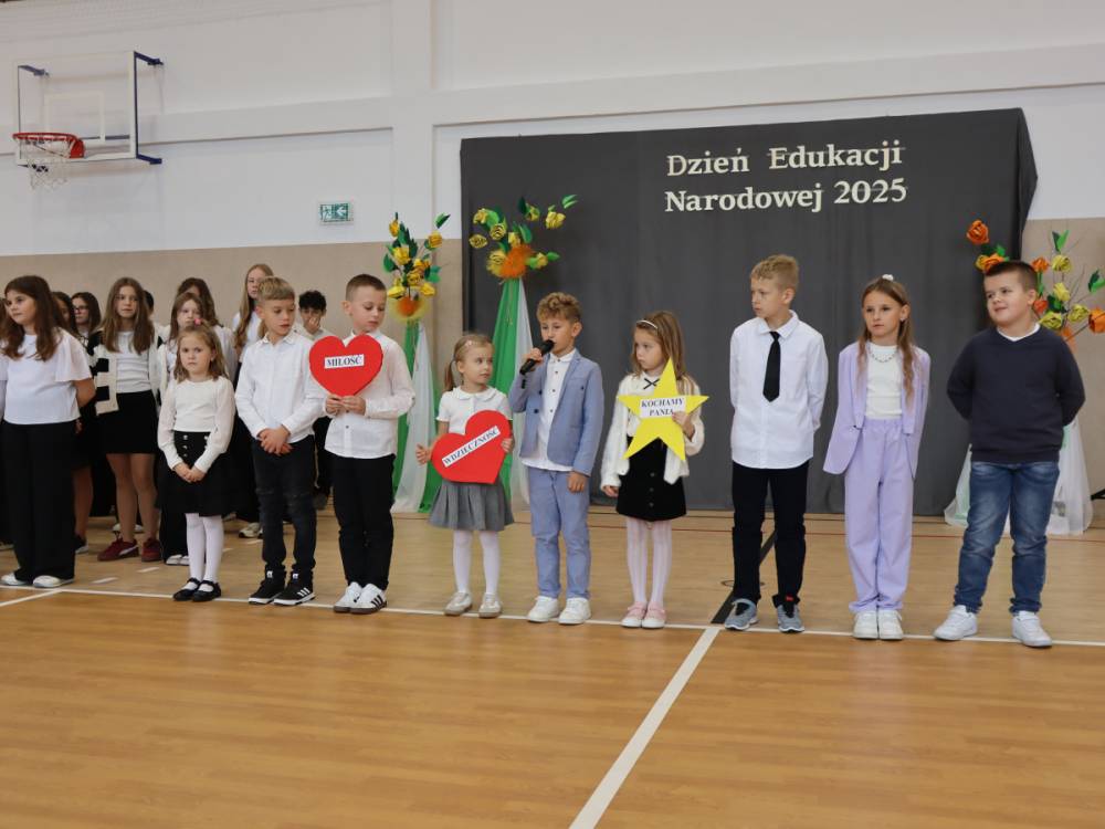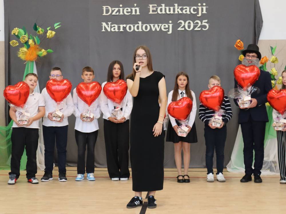 10 października w naszej szkole odbyły się uroczyste obchody Dnia Edukacji Narodowej. Z tej okazji przygotowany został apel, w którym swoje talenty zaprezentowały dzieci z grup przedszkolnych oraz przedstawiciele uczniów klas I–VIII. Poprzez wiersze, piosenki i krótkie inscenizacje uczniowie w piękny i wzruszający sposób wyrazili wdzięczność oraz serdeczne podziękowania wszystkim pracownikom szkoły – nauczycielom, wychowawcom, a także pracownikom administracji i obsługi. Program artystyczny pełen był radości, uśmiechów i ciepłych życzeń, które zostały przyjęte z ogromnym uznaniem. Na zakończenie uroczystości uczniowie wspólnie odśpiewali tradycyjne „Sto lat”, a następnie wręczyli drobne, symboliczne upominki przygotowane przez Samorząd Uczniowski.