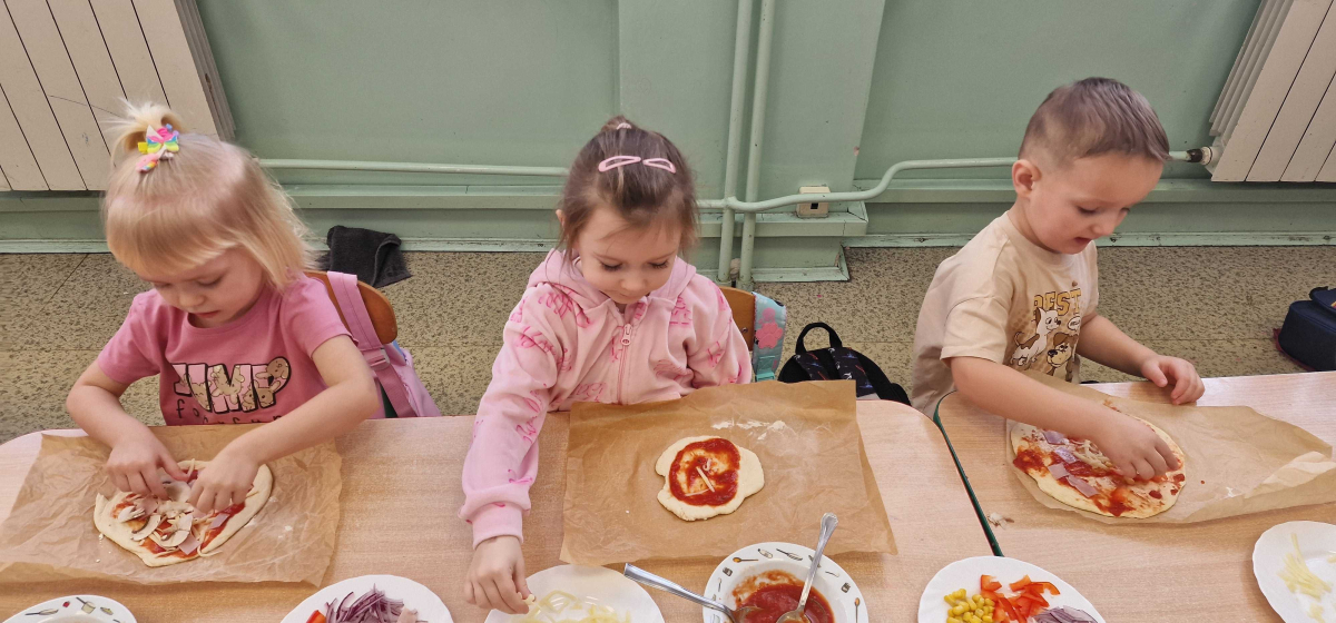 Podczas zajęć dzieci miały okazję wcielić się w rolę prawdziwych kucharzy i samodzielnie stworzyć swoje własne pizze. Każde dziecko komponowało ulubione składniki, układając je na cieście, ćwicząc przy tym sprawność manualną, wyobraźnię oraz podejmowanie decyzji. Powstały kolorowe i bardzo pomysłowe kompozycje – od klasycznych pizz z serem i pieczarkami, po zupełnie fantazyjne wersje z dużą ilością dodatków.