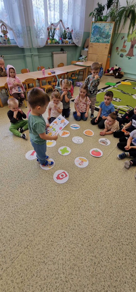 Dzień Pizzy był także okazją do rozwijania kompetencji matematycznych i logicznego myślenia. Przedszkolaki uczestniczyły w zabawie w kodowanie na dywanie. Dzieci poruszały się według ustalonego kodu, wykorzystując obrazki związane z pizzą – takie jak plasterki sera, pomidory, oliwki czy kawałki pizzy. Zadaniem było odczytywanie prostych instrukcji i odnajdywanie właściwej drogi. Zabawa wzbudziła wiele emocji i zaangażowania, a jednocześnie uczyła współpracy oraz koncentracji.