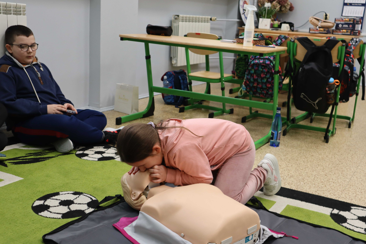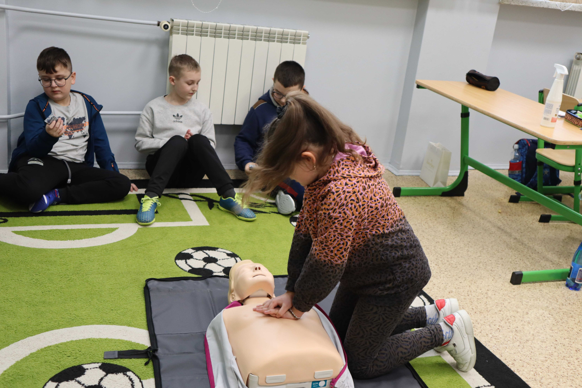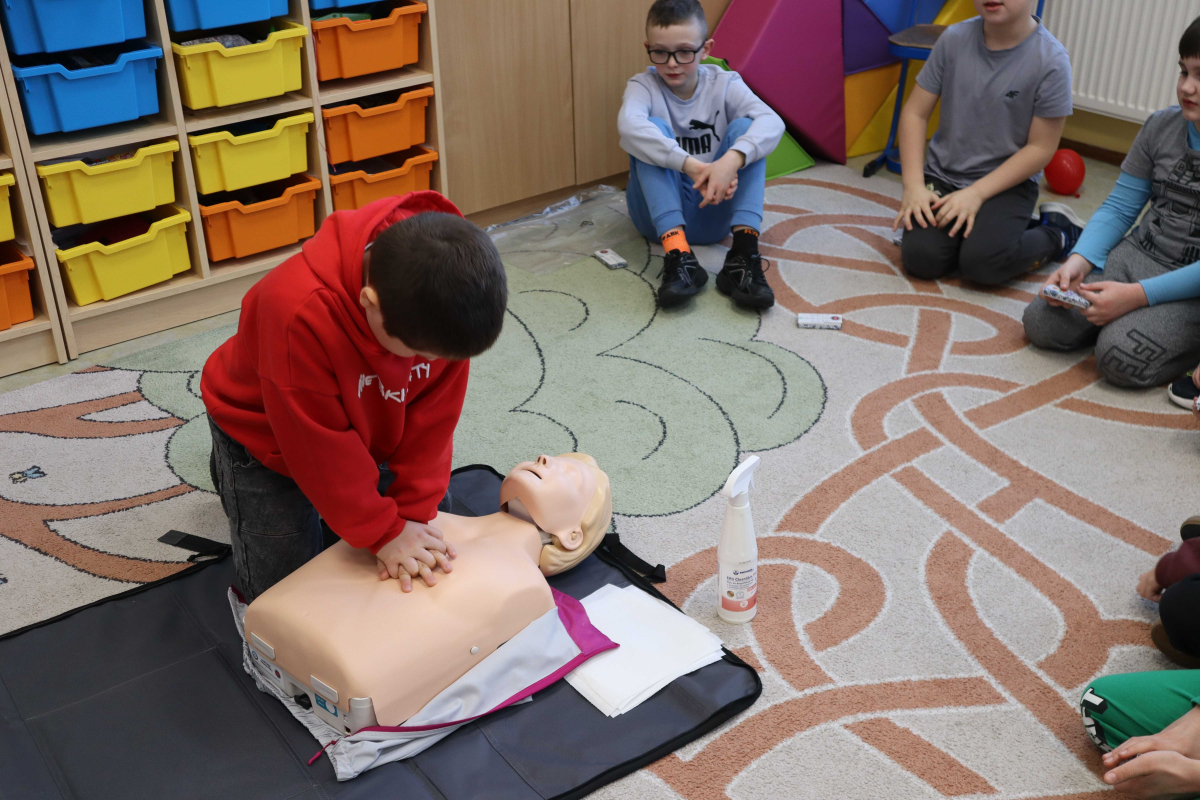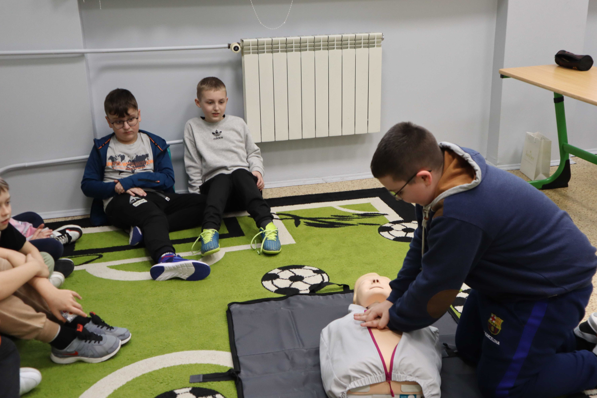 Największe emocje wzbudziły ćwiczenia praktyczne na fantomach. Pod czujnym okiem nauczycieli, każdy chętny uczeń mógł podjąć próbę wykonania resuscytacji krążeniowo-oddechowej. Mali ratownicy z ogromnym skupieniem liczyli uciśnięcia klatki piersiowej, dbając o odpowiednie tempo i siłę. Warsztaty objęły również:
