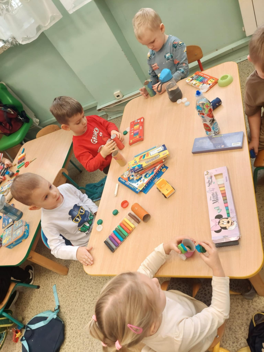 Podczas styczniowej realizacji innowacji pedagogicznej pt. „Zabawa w rytmie dziecięcej wyobraźni – świat bez zabawek jako przestrzeń kształtowania aktywności twórczej dzieci” przedszkolaki z grupy młodszej uczestniczyły w zajęciach konstrukcyjno-plastycznych, których efektem było stworzenie wagoników z materiałów wtórnych: rolek po papierze toaletowym i nakrętek od butelek. Czynności miały charakter swobodnej aktywności twórczej, opartej na samodzielnych pomysłach kilkulatków.