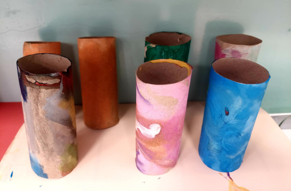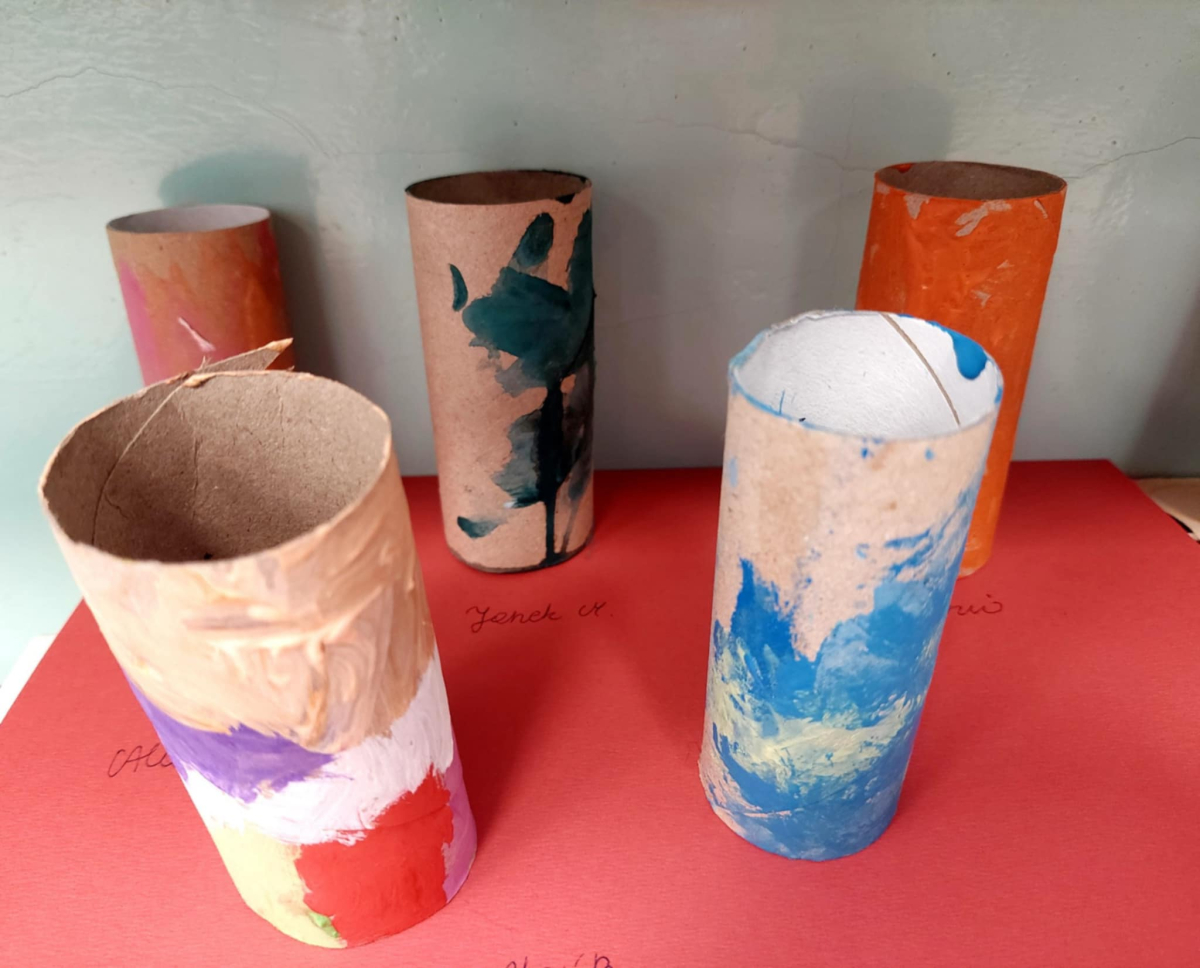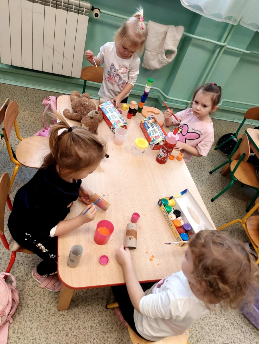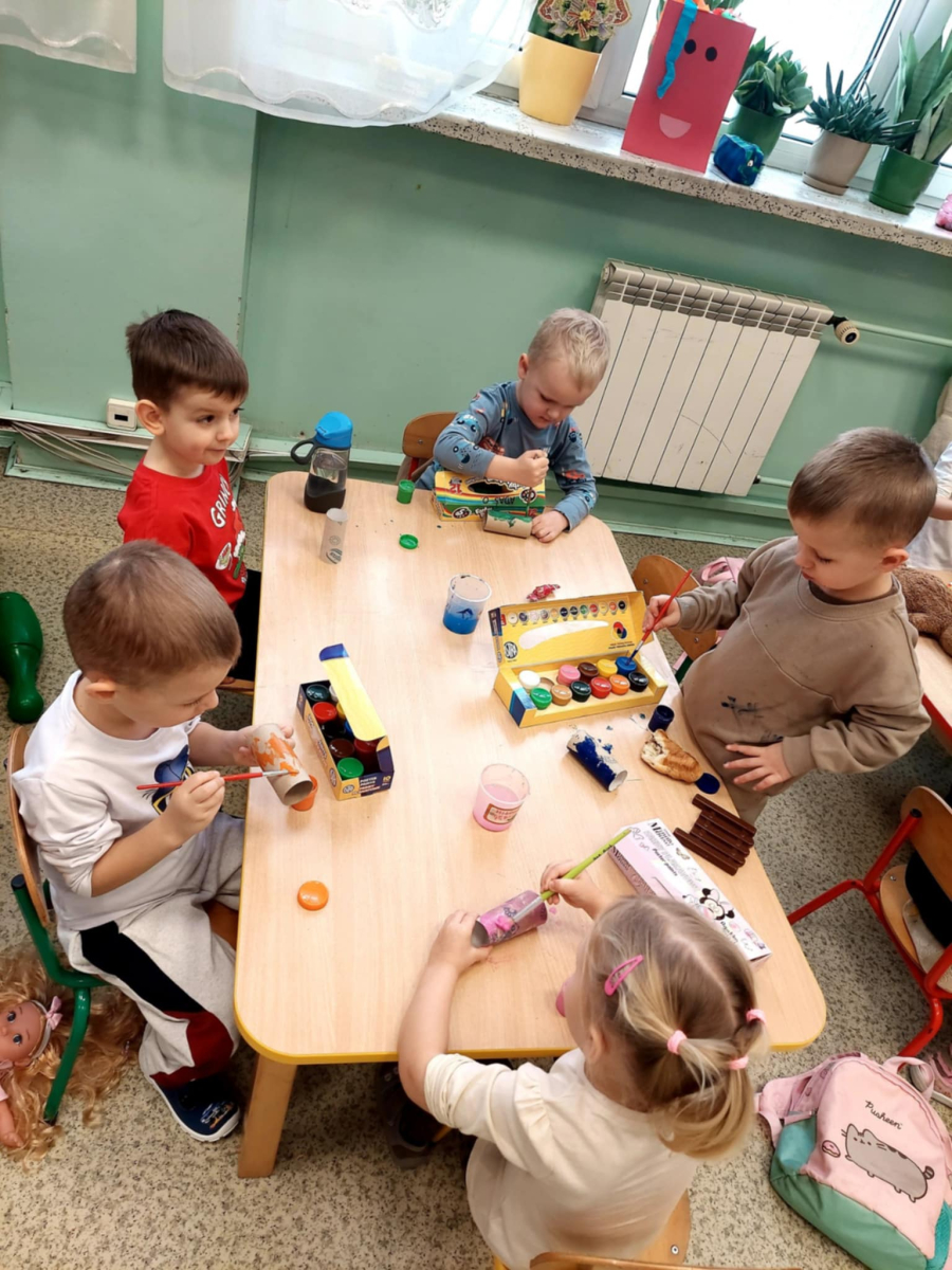Praca nad wagonikami przebiegała etapami. W pierwszej części dzieci malowały rolki farbami, dobierając kolory, wzory i zdobienia według własnych pomysłów. Każdy wagonik był inny i odzwierciedlał indywidualną wizję wykonawcy. Po wyschnięciu farby, maluchy przystąpiły do mocowania kół z nakrętek, wykorzystując plastelinę. Przedszkolaki eksperymentowały z ustawieniem elementów, sprawdzały, czy wagoniki „jadą”, poprawiały konstrukcje i wzajemnie podpowiadały sobie rozwiązania.