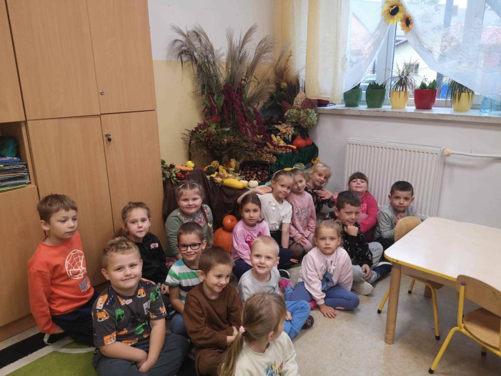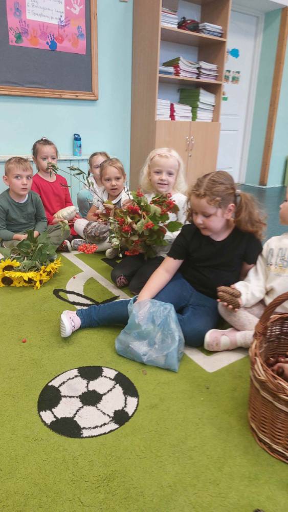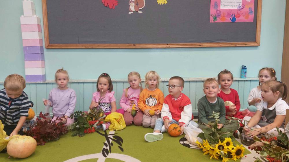 29 września dzieci z grupy średniej i starszej powitały jesień wykonując wystawki przyrodnicze. Na początku zajęć dzieci wysłuchały pogadanek wychowawczyń na temat zjawisk pogodowych charakterystycznych dla jesieni i różnych ciekawostek ze świata przyrody. Następnie dzieci wymieniały nazwy przyniesionych okazów przyrodniczych, określały kolory, przeznaczenie. Kolejnym etapem zajęć było tworzenie wystawek z darów jesieni min. owoców jarzębiny, kasztanów, żołędzi, traw, kwiatów, warzyw i owoców. Wystawki będą nam towarzyszyć przez całą jesień i dostarczać środków do zajęć dydaktycznych. Podczas wykonywania wystawki dzieci miały możliwość doświadczania sensorycznego i oswajania z różnymi rodzajami faktur naturalnych.