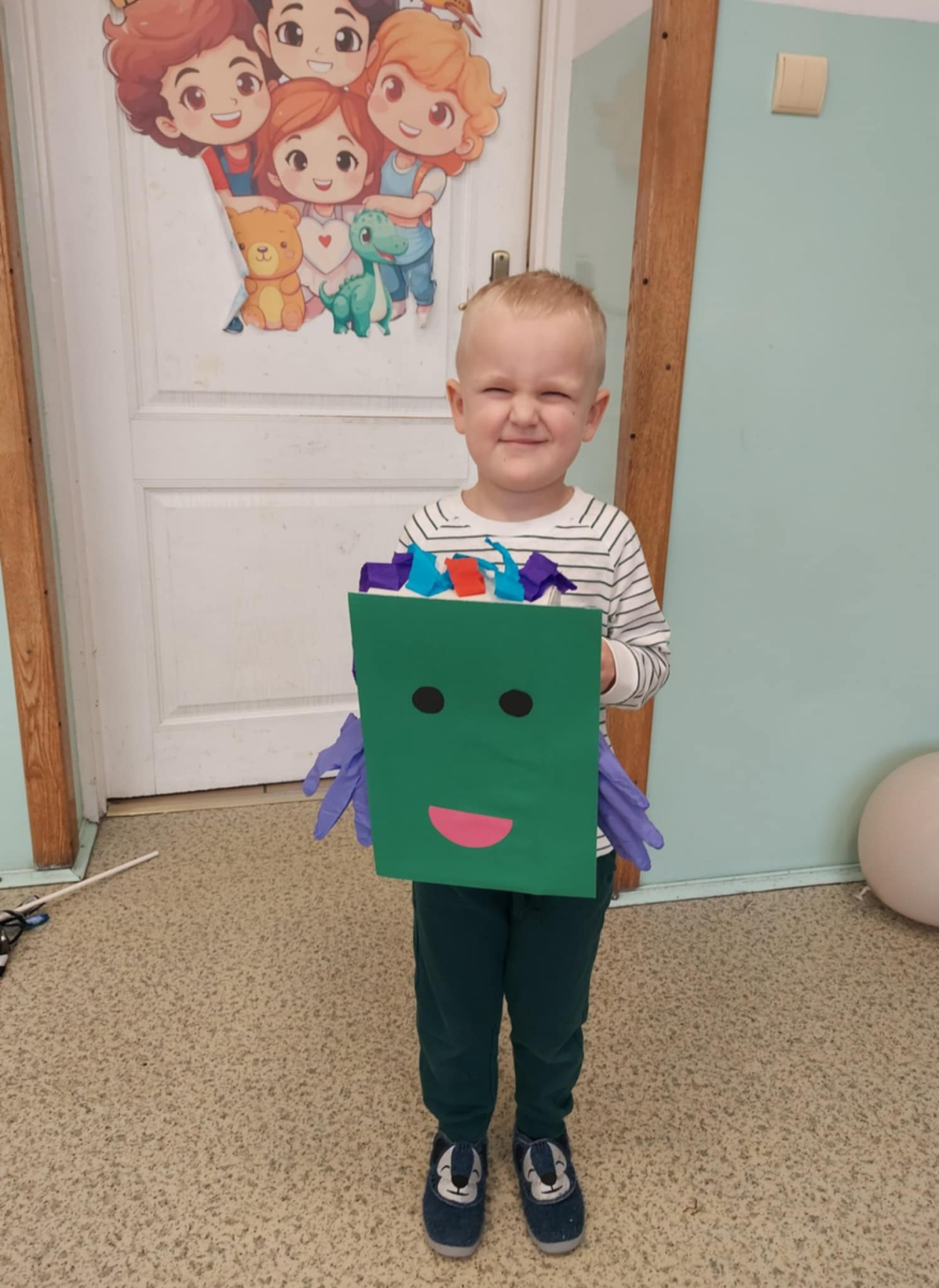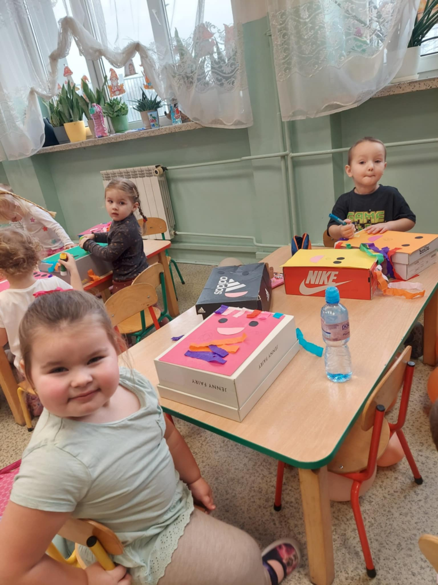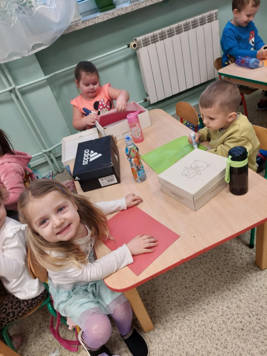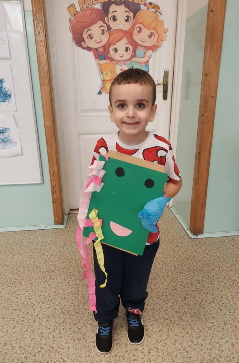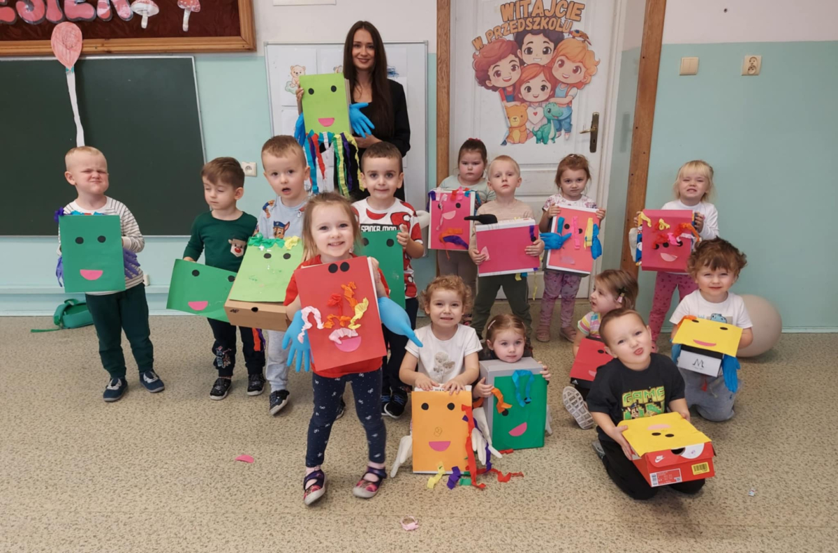 W ramach grudniowej realizacji innowacji pedagogicznej pt. ,,Zabawa w rytmie dziecięcej wyobraźni – świat bez zabawek jako przestrzeń kształtowania aktywności twórczej dzieci’’ przedszkolaki z grupy młodszej miały okazję wejść w świat twórczych eksperymentów, tworząc własne roboty z materiałów wtórnych i recyklingowych: pudełek po butach, gumowych rękawiczek, bibuły i kolorowego papieru.