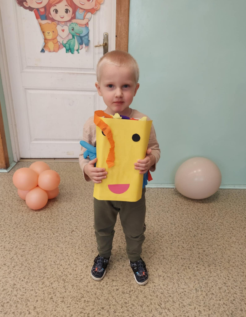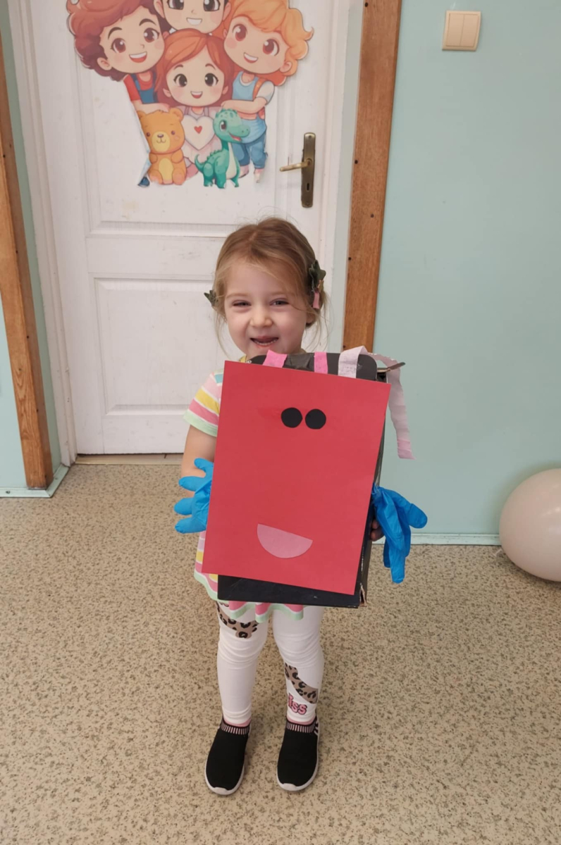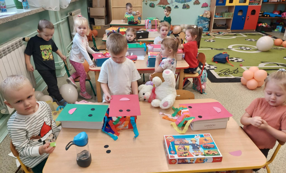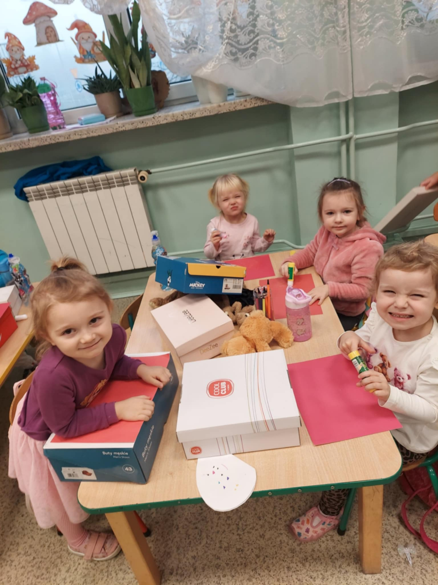 W ramach grudniowej realizacji innowacji pedagogicznej pt. ,,Zabawa w rytmie dziecięcej wyobraźni – świat bez zabawek jako przestrzeń kształtowania aktywności twórczej dzieci’’ przedszkolaki z grupy młodszej miały okazję wejść w świat twórczych eksperymentów, tworząc własne roboty z materiałów wtórnych i recyklingowych: pudełek po butach, gumowych rękawiczek, bibuły i kolorowego papieru.