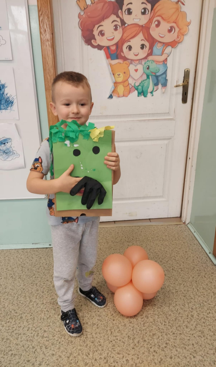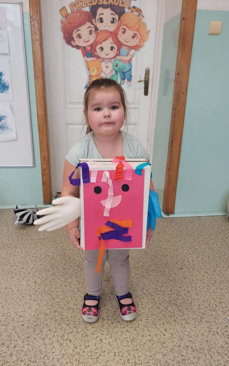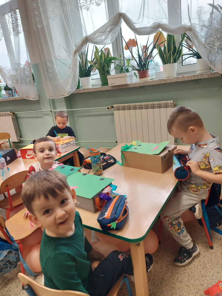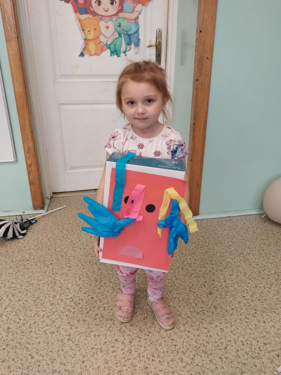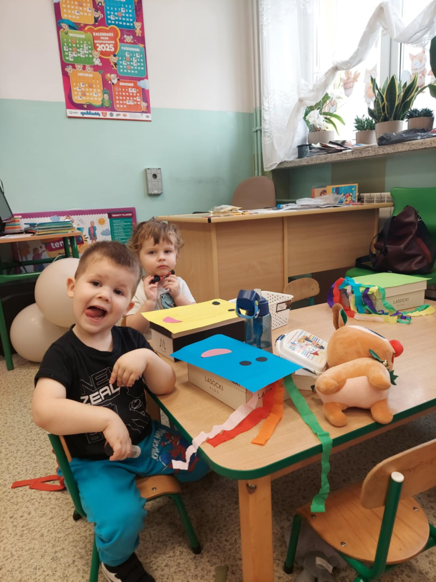 W ramach grudniowej realizacji innowacji pedagogicznej pt. ,,Zabawa w rytmie dziecięcej wyobraźni – świat bez zabawek jako przestrzeń kształtowania aktywności twórczej dzieci’’ przedszkolaki z grupy młodszej miały okazję wejść w świat twórczych eksperymentów, tworząc własne roboty z materiałów wtórnych i recyklingowych: pudełek po butach, gumowych rękawiczek, bibuły i kolorowego papieru.
