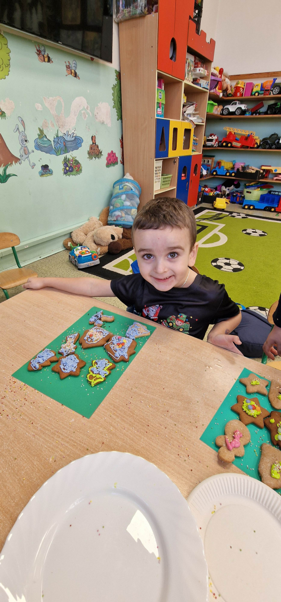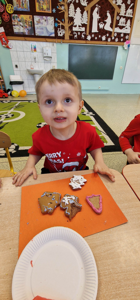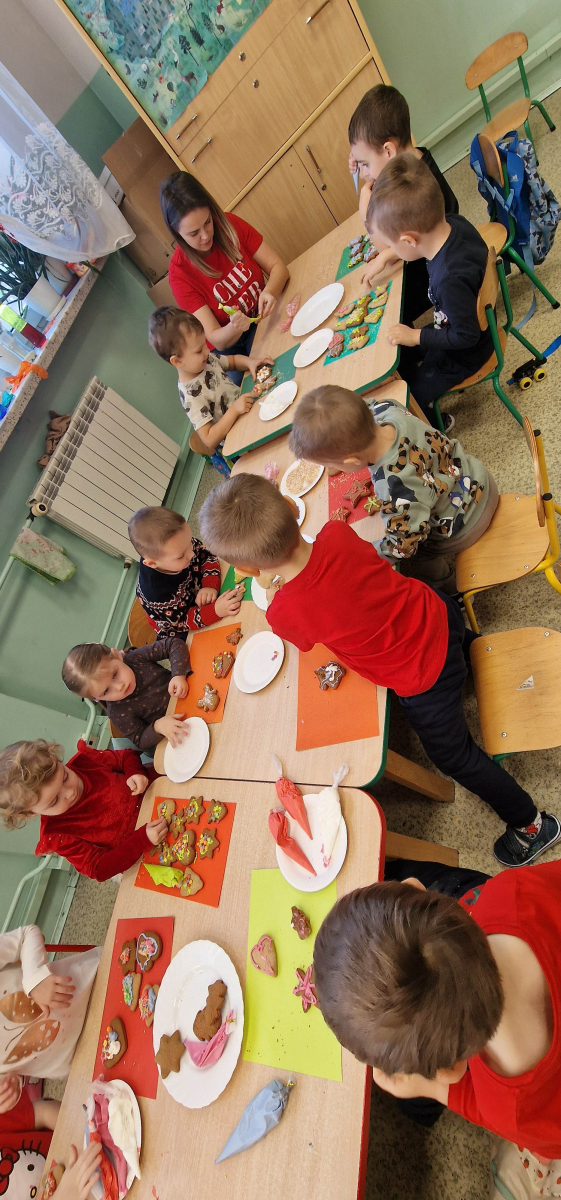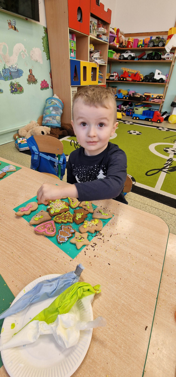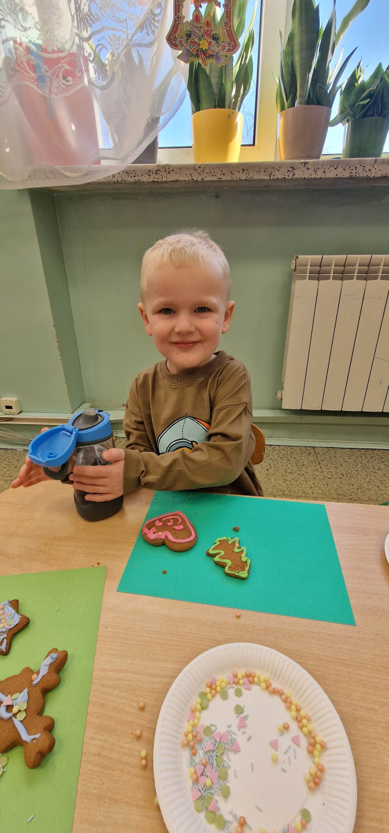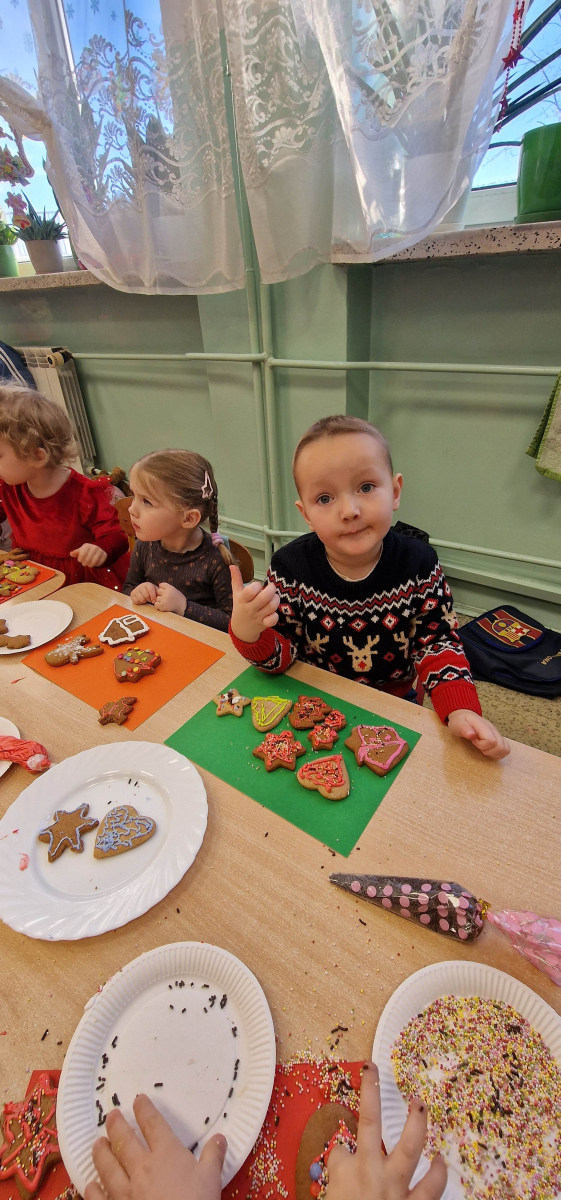 W grudniu w młodszej grupie przedszkolnej odbyły się wyjątkowe, świąteczne zajęcia poświęcone ozdabianiu pierniczków. Dzieci z wielkim zaangażowaniem i radością tworzyły własne, niepowtarzalne piernikowe dekoracje, rozwijając przy tym kreatywność, sprawność manualną oraz wyobraźnię.